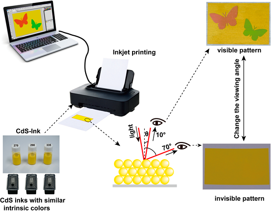 光子晶体,是一种由不同介电常数的材料在空间上形成的周期性规整排列的结构。其特点是光子禁带的存在,如果光子禁带落在可见光区,光子晶体就会产生亮丽的颜色,被称为光子晶体结构色。光子晶体结构色相对于传统的染料和颜料产生的颜色,具有颜色亮丽、具有金属光泽和超高的光稳定性等特点。由于喷墨打印是实现彩色图案化最简单便捷的手段,近年来,喷墨打印光子晶体结构色图案引起了广大研究者的兴趣。但是,由于需要形成长程规整的有序结构,目前研究的光子晶体结构色通常是打印在表面处理过的高分子基材上或者需要特殊的沉积打印仪。本课题组武素丽副教授和刘宝琦硕士生设计合成、粒径均一、具有高介电常数的无机金属化合物微球。采用特定粒径的微球制成红、绿、橙等多色墨水,采用常用的喷墨打印机,在相纸上可以打印出颜色亮丽的光子晶体结构色图案。同时,利用光子晶体结构色与角度相关的特点,可以实现图案在不同角度下的隐藏和显现,实现很好的防伪效果。由于该防伪的实现只需在不同的观察角度即可实现,无需以往光子晶体防伪研究中需要加入刺激性溶剂来实现图案的显现,具有便捷、耐用的特点。该研究成果发表在The Journal of Physical Chemistry Letters 2017, 8,2835-2841,而且被作为Spotlights 论文.